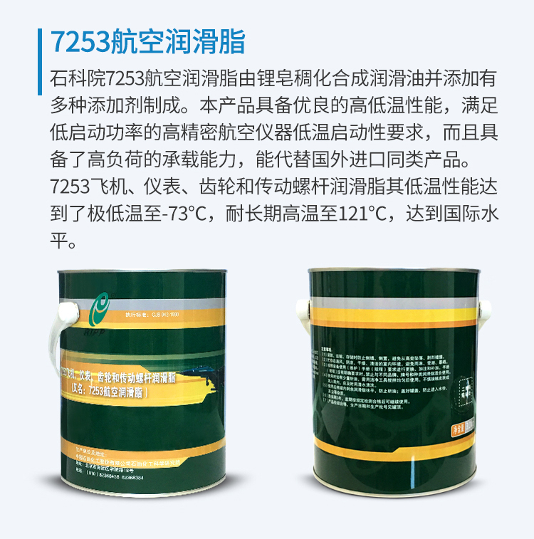 7253航空潤滑脂是我國軍方及國產飛機廣泛使用的潤滑產品,取代了80年代以前使用的7008、7008-1及7012航空潤滑脂,其低溫性能達到了極低溫至-73℃,耐長期高溫至121℃,達到業界先進水平。